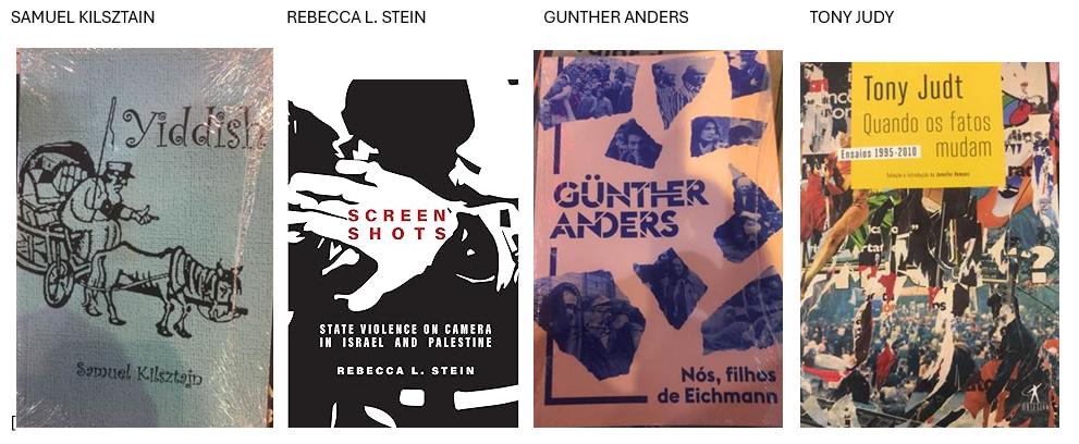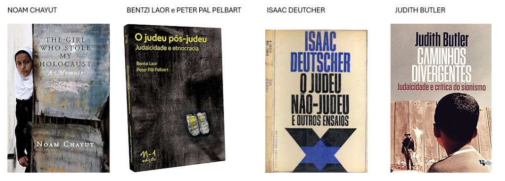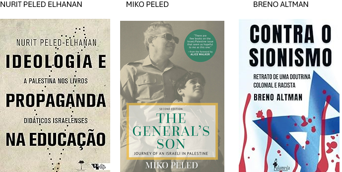 ILAN PAPPE, SCHLOMO SAND, NORMAN FILKENSTEIN, GIDEON LEVY, AVI SCHLAIM, NURID PELED, MIKO PELED, AMOS OZ, HARVEY PEKAR, EDWIN BLACK, RALPH SCHOENMANN, TONY JUDT, JUDITH BUTLER, ISAAC DEUTCHER, BENTZI LAOR e PETER PAL PELBART, NOAM CHAYUT, SIGMUND FREUD, HANNAH ARENDT, EDGAR MORIN, KARL MARX, BRENO ALTMAN, NOGA KADMAN, NIELS PETER LEMCHE, ALBERT EINSTEIN, IMRE KERTSZ, ANTONY LOEWENSTEIN, GUNTHER ANDERS, STEPHEN ZWEIG, SAMUEL KILSZTAIN, REBECCA STEIN, OMER BARTOV, EYAL WEIZMAN, ARIELA AISHA AZOULAY, GEORGES DIDI HUBERMAN, ANDREAS MALM, VICTOR KLEMPERER, HAJO MEYER, RAZ SEGAL, BENJAMIN MOSER, ALLAU BROWNFELD, YEHUD MENUCHEN, DANIEL BARENBOIM, AMNON RAZ KRAKOTZKIN