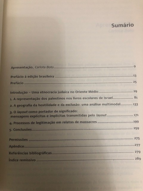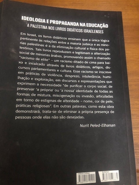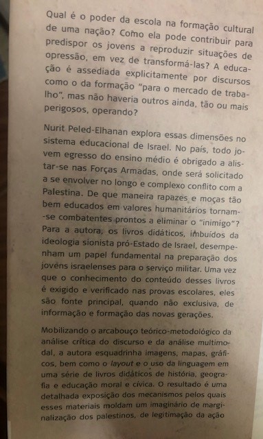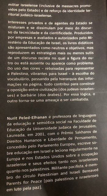 Neste estudo, a professora de inguagem da educação Nurit Peled-Elhanan investiga os recursos utilizados em livros didáticos de Israel para representar a população palestina. A autora israelense examina a apresentação de imagens, mapas, layouts
